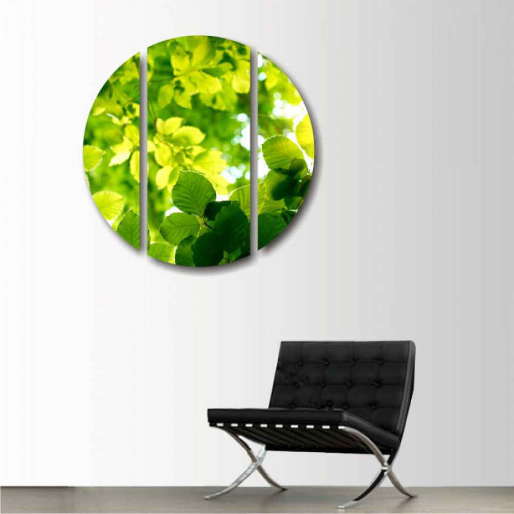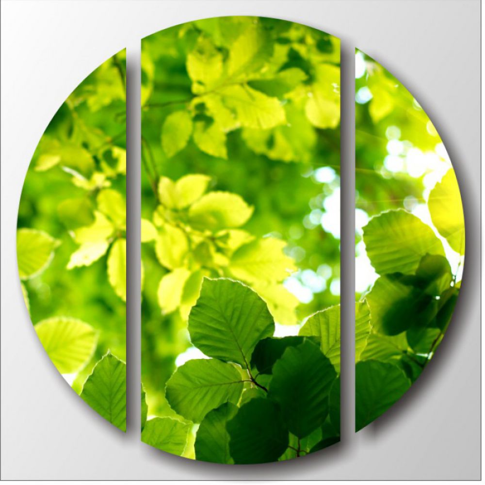 Модульная картина триптих "Зеленые листья и лучи солнца" круглой формы.